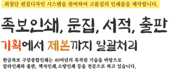 SERVICE주요업무 기획 / 디자인 / 편집각종 디자인 프로그램을 완비하여 편집 각종책자/출판물/족보/문집최고의 편집시스템과 오랜 경험을 바탕으로 작업 디지털인쇄/칼라인쇄/소량인쇄최신 디지털인쇄기 도입으로 고해상도의 인쇄물 카달로그/브로슈/전단 등 홍보물참심한 홍보물 제작은 사업신장의 지름길 GALLERY작업 갤러리 책자(케이스) 전문서적 연보 연감 C/S CENTER고객센터 고객상담02.2272.0045HP. 010.6272.0045FAX. 02.2268.3006 상담시간평 일 am 09:00 – pm 07:00토요일 am 09:00 – pm 03:00궁금하신 사항은 언제든지 문의주세요. 웹하드 이용정보ID : goprint / PW : 2272필요한 자료를 올리거나 다운받으세요!